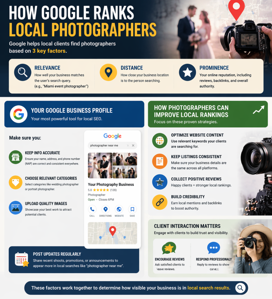 Your Google Business Profile is one of the most important tools for local SEO in the U.S. It helps potential clients find your photography business when they search for services nearby.
