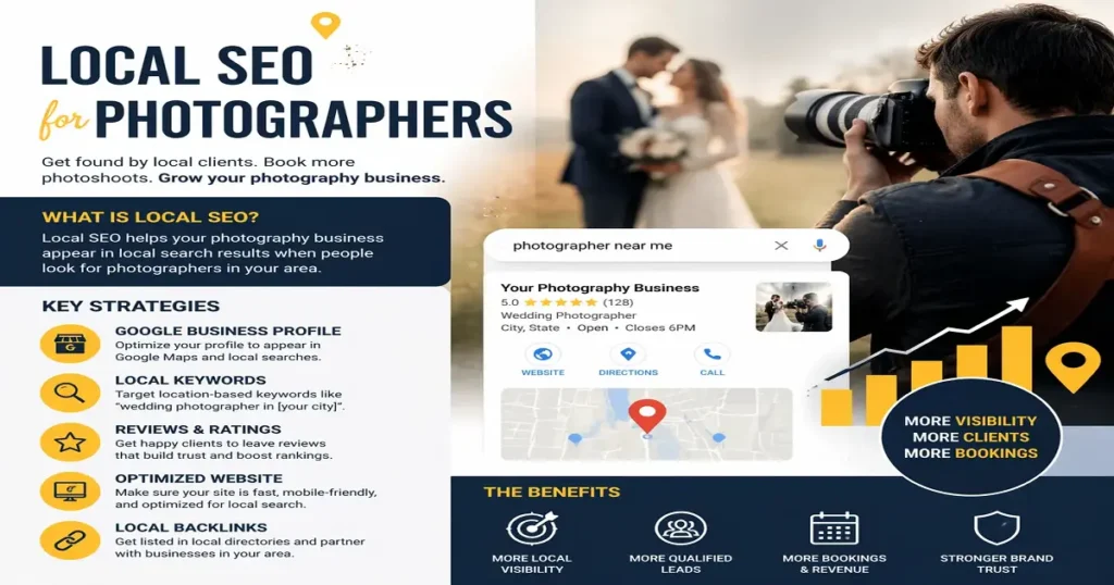 Local SEO for photographers is the process of optimizing your online presence to appear in location-based searches like “wedding photographer in New York” or “photographer near me.” Unlike global SEO, which targets a broad audience, local SEO focuses on attracting clients in specific cities or neighborhoods. This includes optimizing your website, Google Business Profile, and local listings. For photographers in the U.S., local SEO is essential for showing up in Google Maps and local search results when potential clients are actively looking to book services nearby.